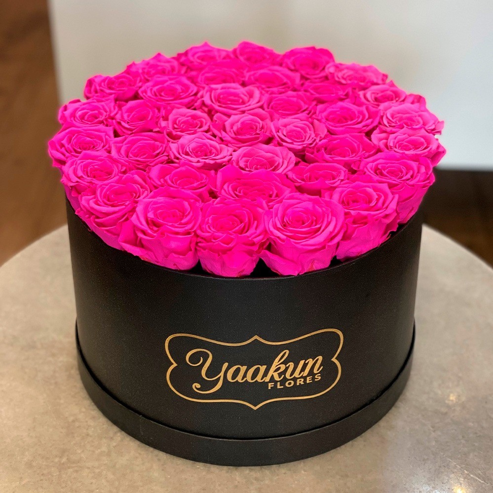 Caja circular negra con aproximadamente 36 rosas preservadas en tonos fuchsia. Las rosas preservadas pueden durar hasta 3 años dependiendo los cuidados y las condiciones climatológicas de cada ciudad.