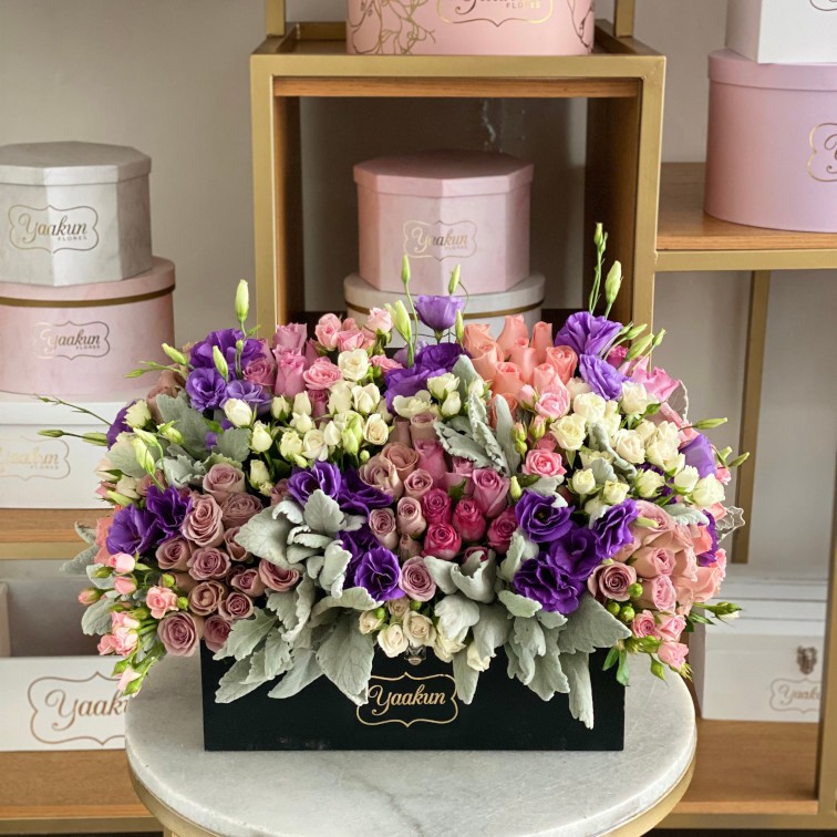 Hermoso diseño floral en un cofre mediano en tonos rosas y morados con 100 rosas , baby rose , lisianthus y Miller .