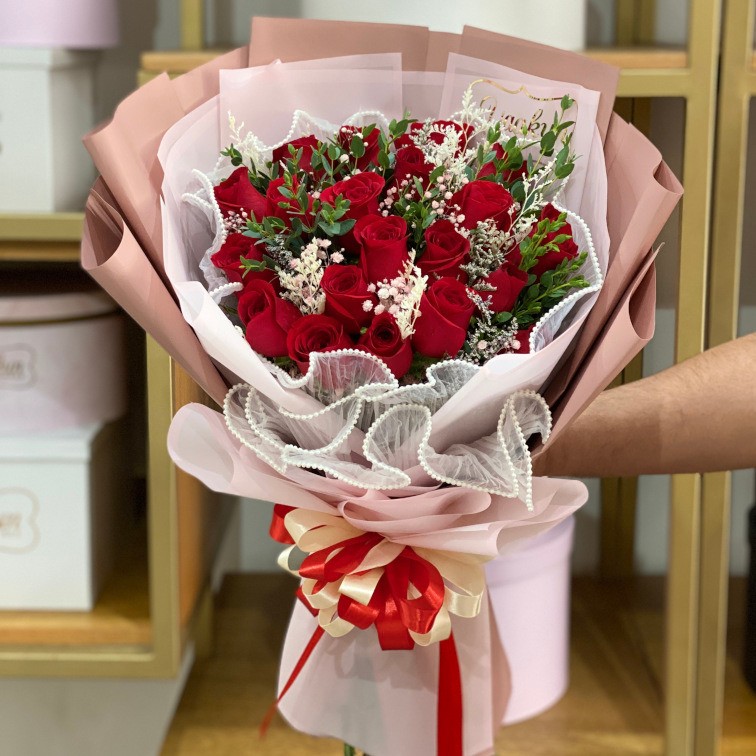 Hermoso y elegante arreglo floral con 50 rosas rojas con contorno de alstro blanca y gypso envuelto en papel coreano