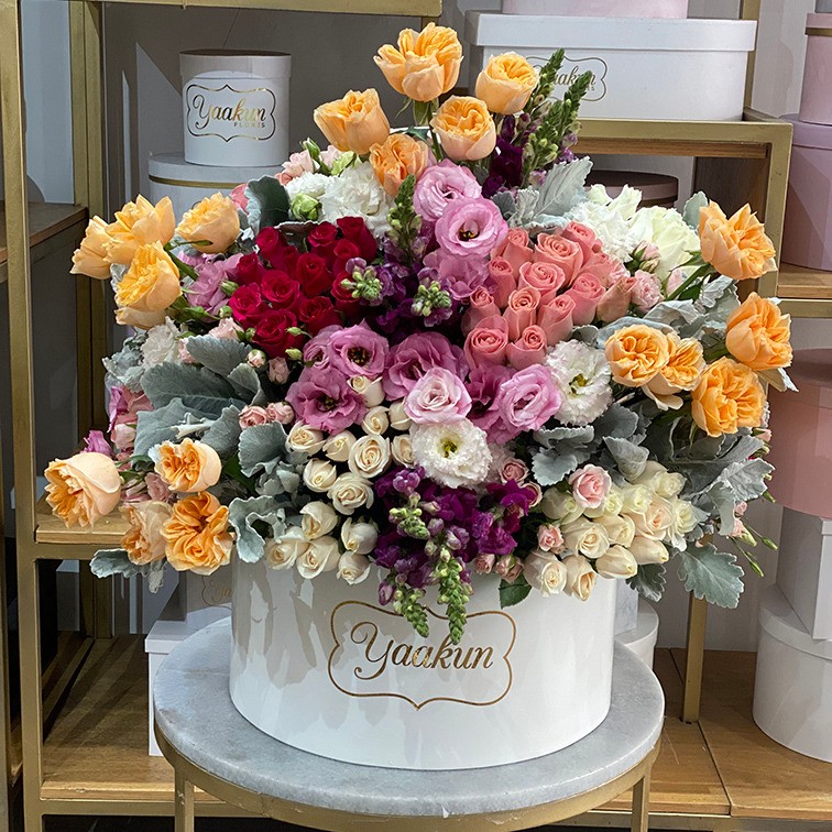 Hermoso arreglo floral en caja blanca con 350 rosas con rosas en 4 tonos.