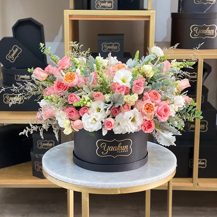 Hermoso y sofisticado arreglo floral en caja circular blanca con 200 rosas en tonos pastel, clavel, perritos, Green, miller y cola de borrego