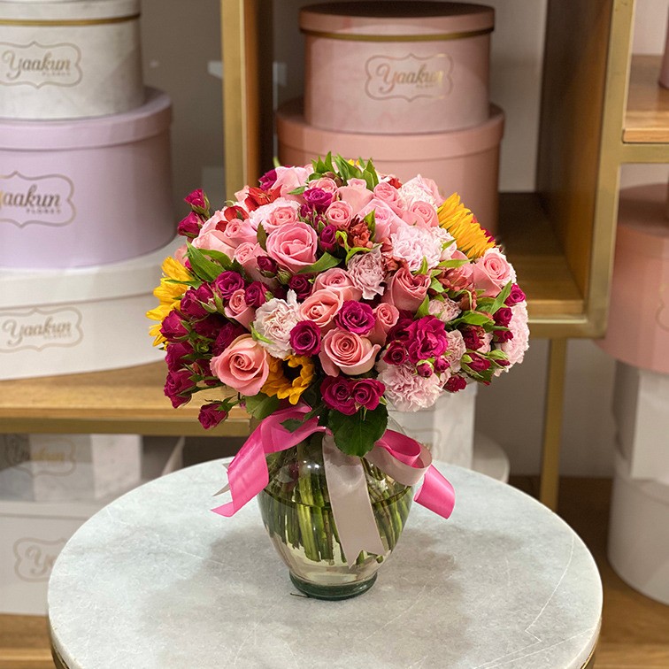Hermoso arreglo floral con rosas, girasoles, lisianthus, roxanas, tulipanes