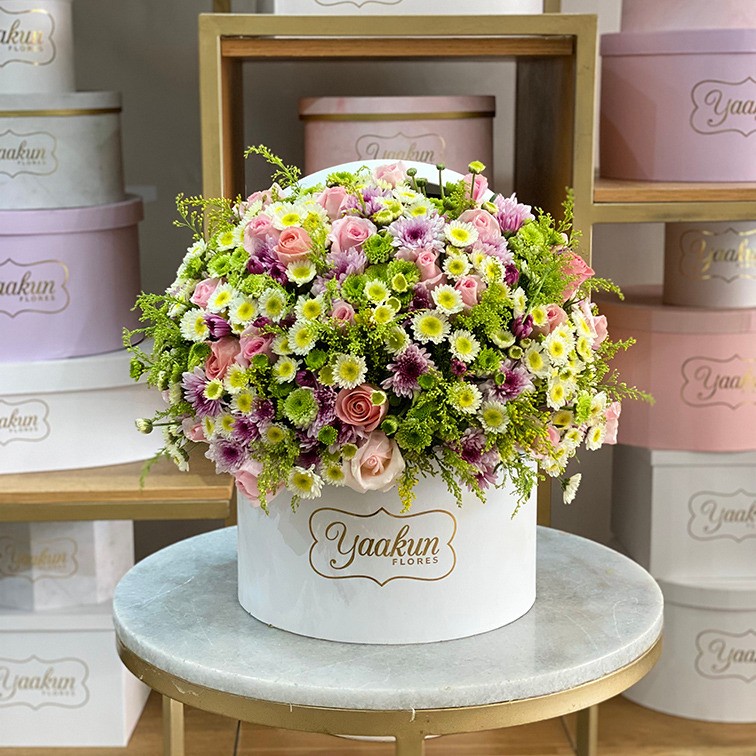 Hermoso y sofisticado arreglo floral en caja circular blanca con 200 rosas en tonos pastel, clavel, perritos, Green, miller y cola de borrego