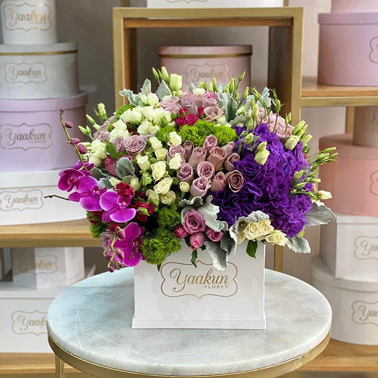 Hermoso diseño floral en mega cofre blanco, compuesto de 200 rosas aprox, lisianthus, 40 tulipanes, ortencias, guny, perritos, amarantos, lentejas, musgo y orquídeas