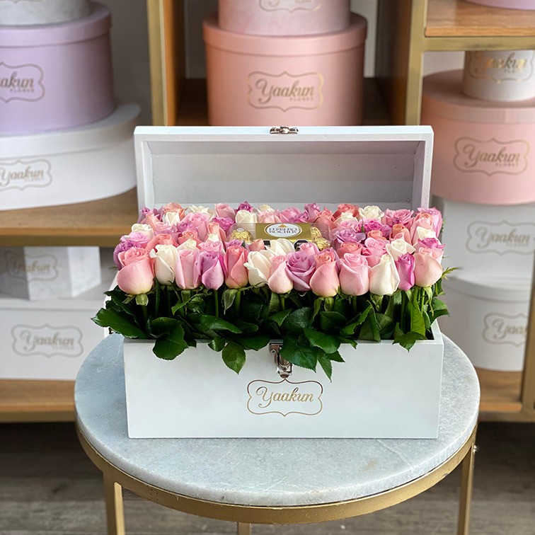 60 rosas en tono pastel y una caja de chocolates Ferrero Rocher dentro de un cofre blanco