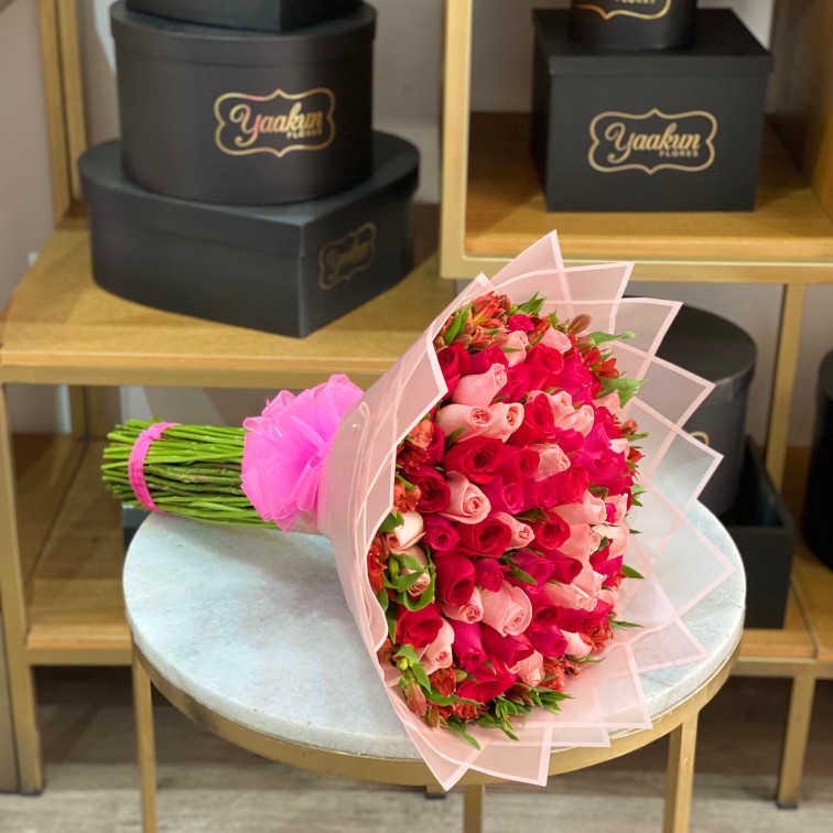Hermoso arreglo floral con 100 rosas y toques de alstromeria en papel coreano