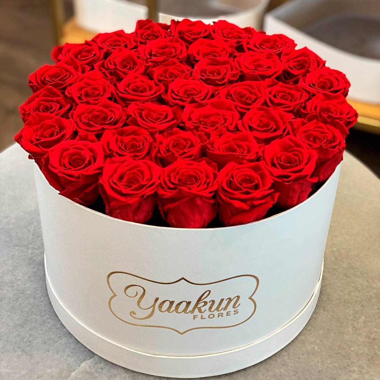 Hermoso diseño con aproximadamente 36 rosas preservadas rojas en caja circular negra. Las rosas preservadas pueden durar hasta 3 años dependiendo los cuidados y las condiciones climatológicas de cada ciudad.